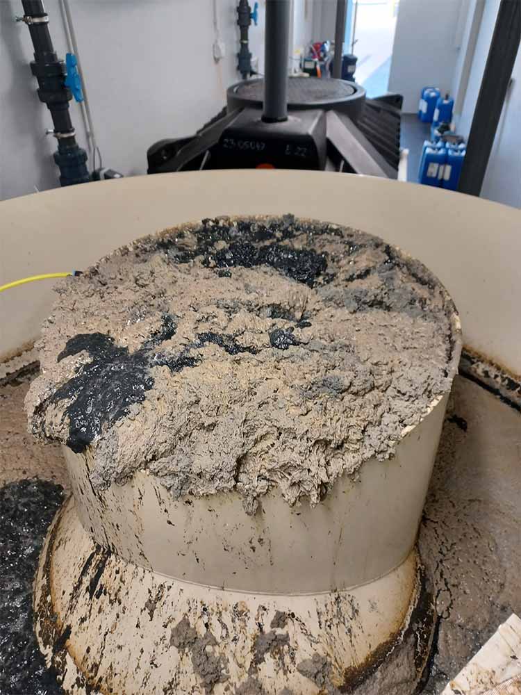 Мул з флотації розчиненим повітрям та реактора з нерухомим шаром обробляється установкою для зневоднення мулу. Вміст води зменшується, завдяки чому витрати на зберігання та утилізацію мінімізуються.